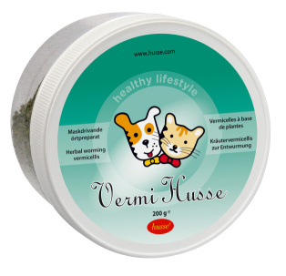 Vermi Husse - prospívá dobré střevní hygieně psů a koček, obsahuje léčivé látky používané pro vykašlávání, odčervení a má desinfekční účinky.