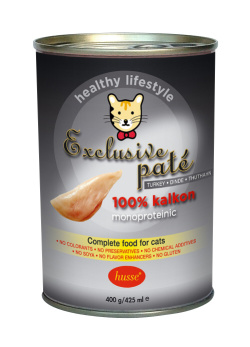 Exclusive paštika krůtí (400g) - paštika vyrobená ze 100% krůtího masa.Krůtí maso jako jediný zdroj bílkovin zamezuje vzniku alergií.Vhodné pro kočky s citlivým zažíváním. Neobsahuje barviva a konzervační látky.